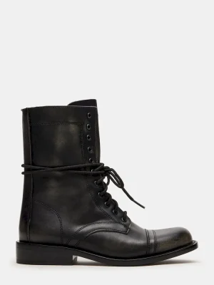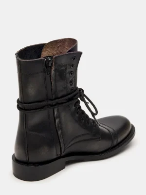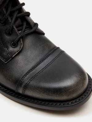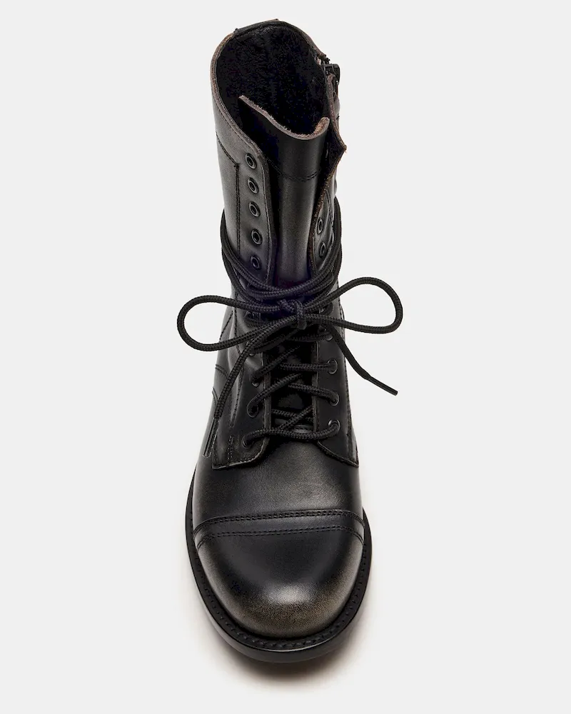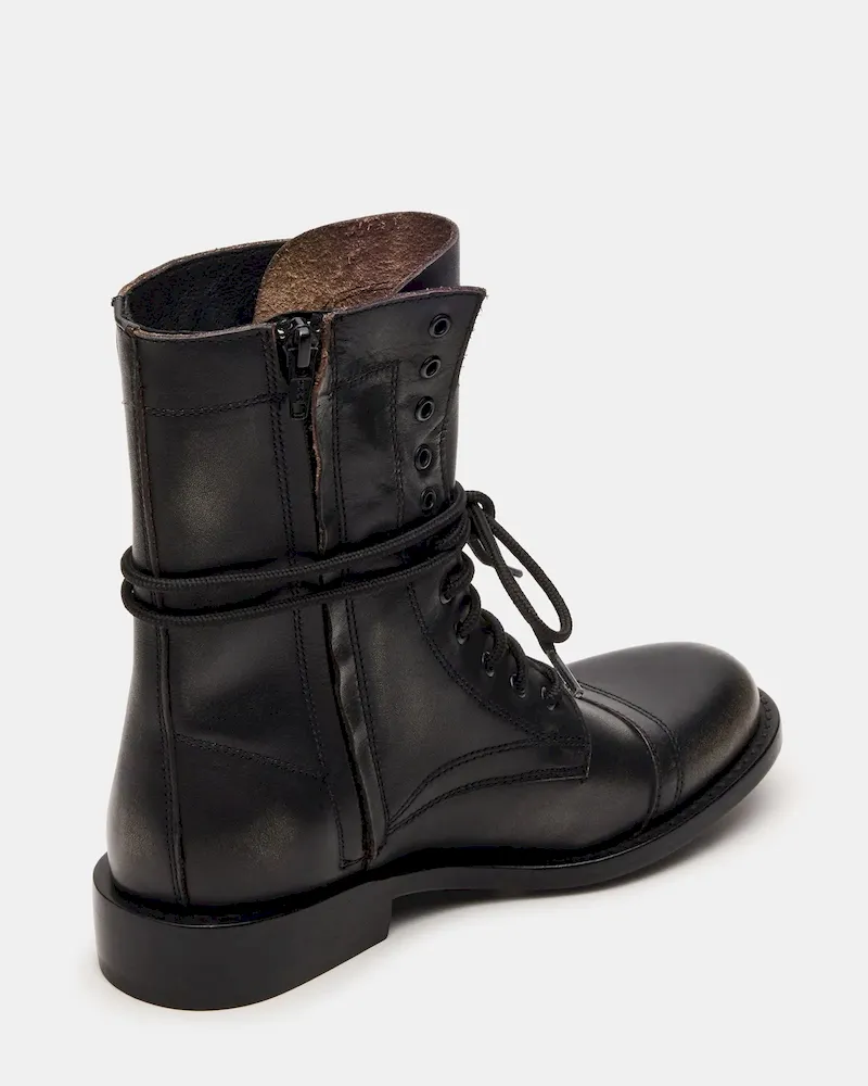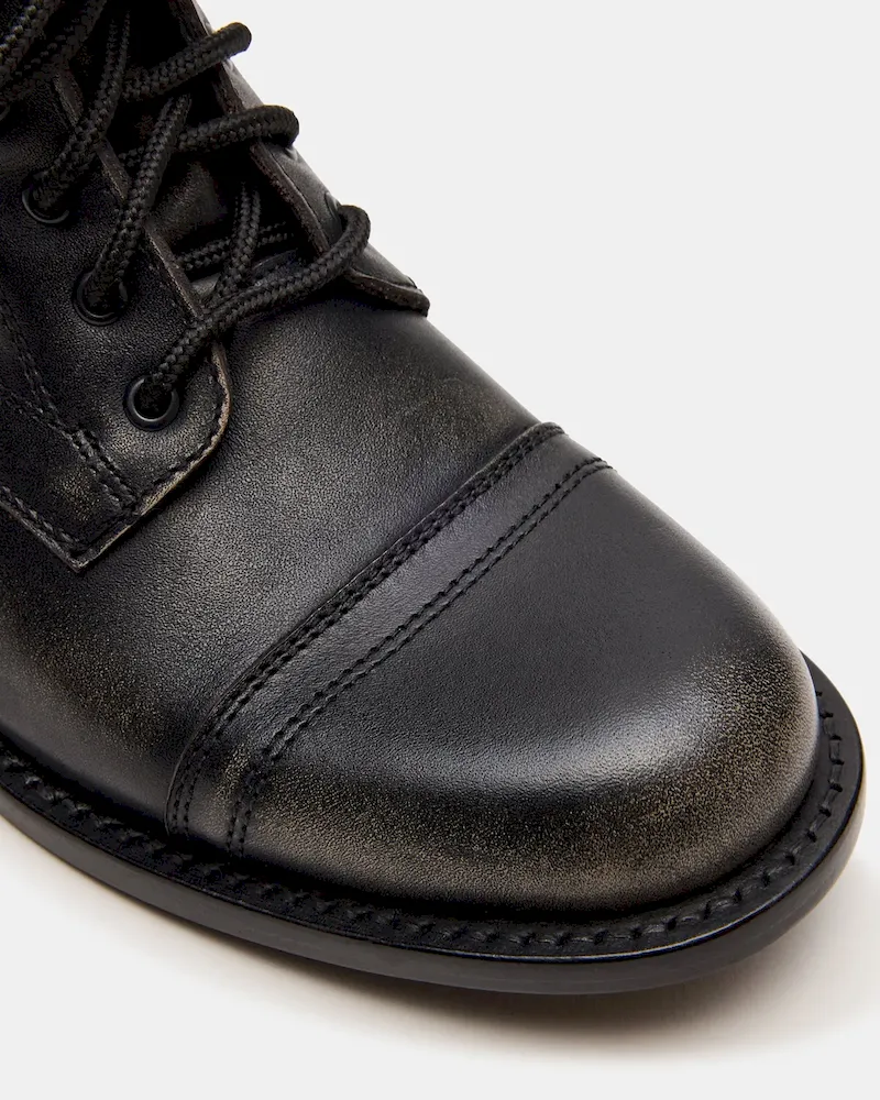 The THERON BLACK DISTRESSED lace-up moto combat ankle boot combines rugged style with durable construction. Designed for reliable wear, this bootie features a distressed finish that adds an edge to any outfit. The secure lace-up design ensures a customized fit, while the sturdy sole offers traction and support suitable for everyday adventures. A perfect choice for those seeking both functionality and bold fashion in a versatile ankle boot.
