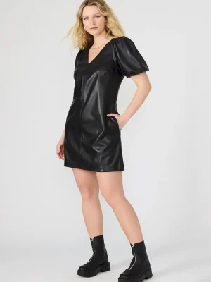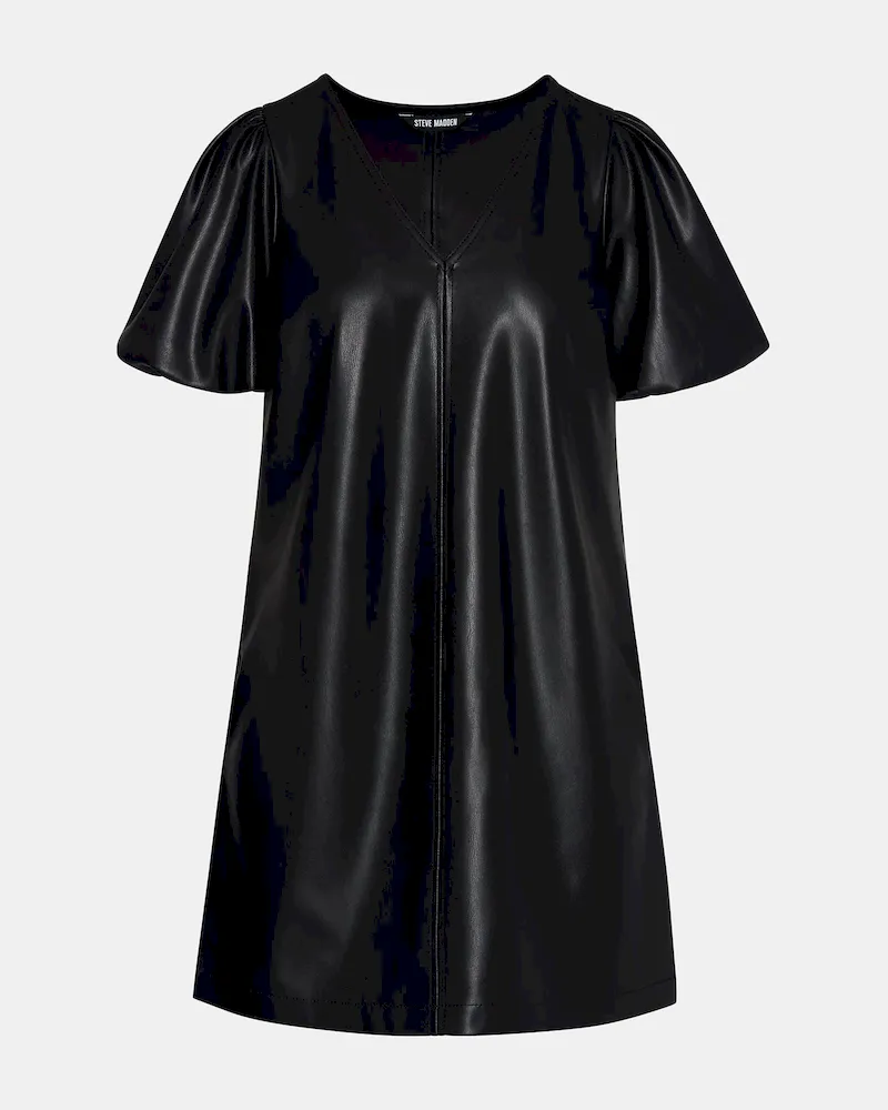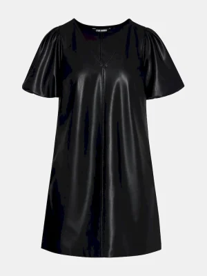 This TILLY short-sleeved mini dress features a sleek faux leather finish and a flattering V-neckline, combining edgy style with a modern silhouette. Perfect for making a bold statement, it offers a sophisticated yet daring look suitable for various occasions.