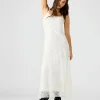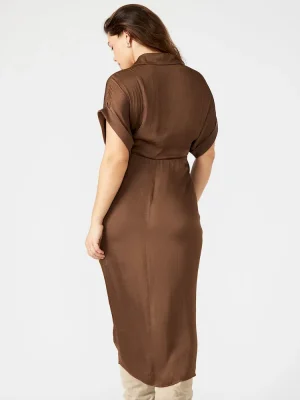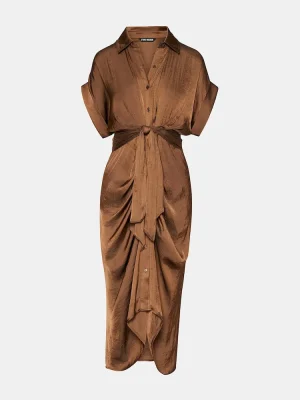 The TORI dress has a rolled collar and cuffed short sleeves, with an adjustable gathered tie-front waist and a high-low hem. The dress is finished with a washed satin texture, giving it a polished look.