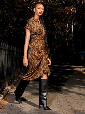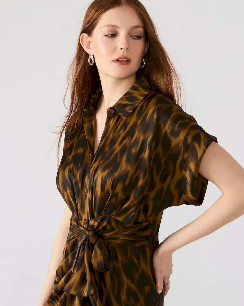 The TORI dress has a rolled collar and cuffed short sleeves, with an adjustable gathered tie-front waist and a high-low hem. The dress is finished with a washed satin texture, giving it a polished look.