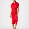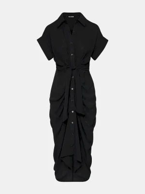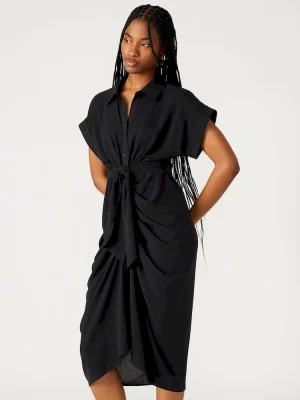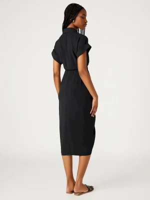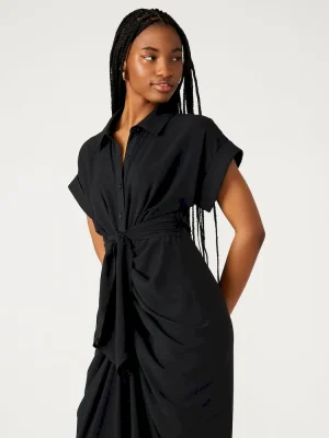 The TORI dress has a rolled collar and cuffed short sleeves, with an adjustable gathered tie-front waist and a high-low hem. The dress is finished with a lightweight woven crepe fabric, giving it a polished look.