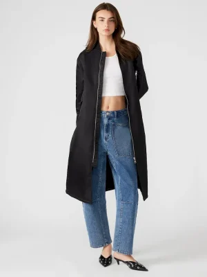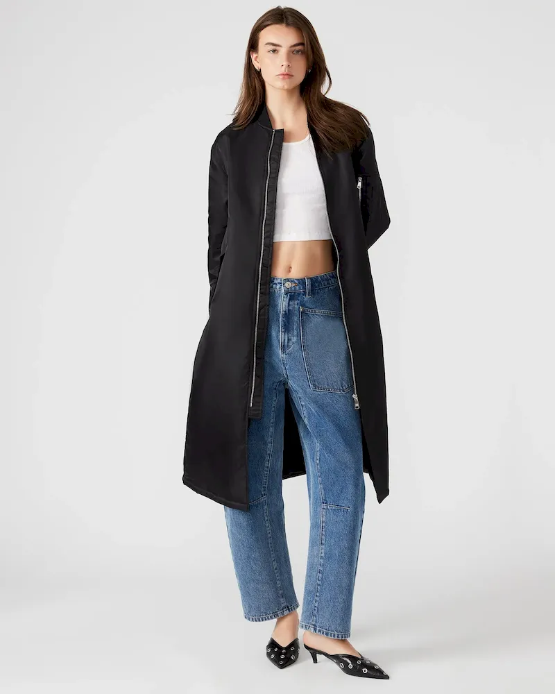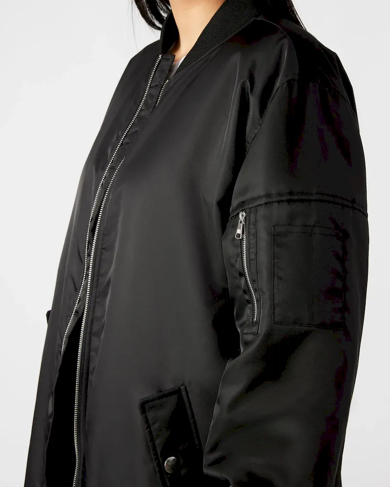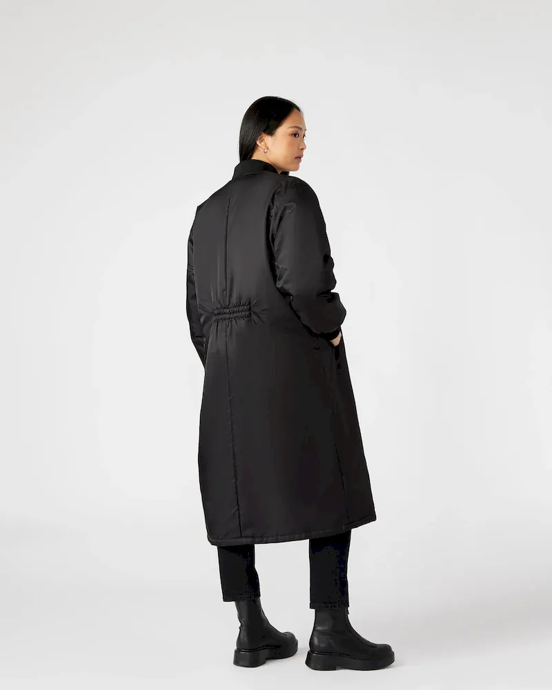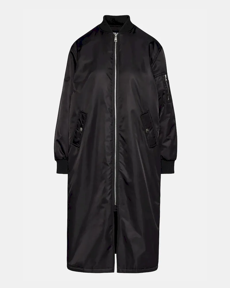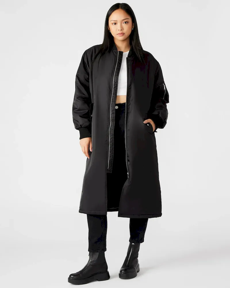 The VINDY coat is a long bomber coat with a variety of features to keep you warm and stylish. The knit rib at the neck and cuffs add a touch of comfort, while the zipper closure and front flap pocket with snap closure provide both functionality and security. The full lining adds an extra layer of insulation, and the elastic waist in the back creates a flattering silhouette.
