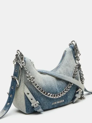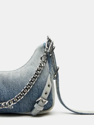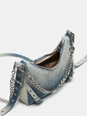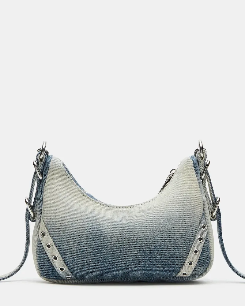 The VITAL denim bag features a slim hobo-inspired silhouette with buckle, chain, and grommet hardware giving the design a little edge.