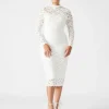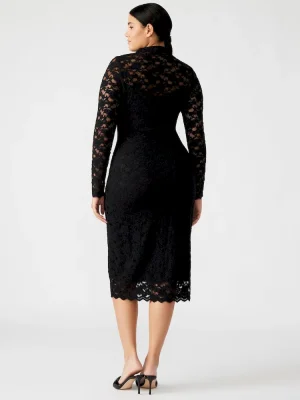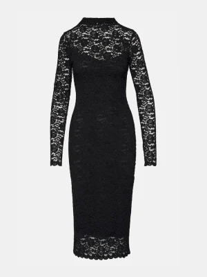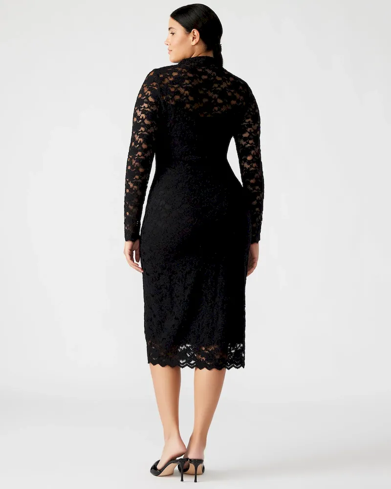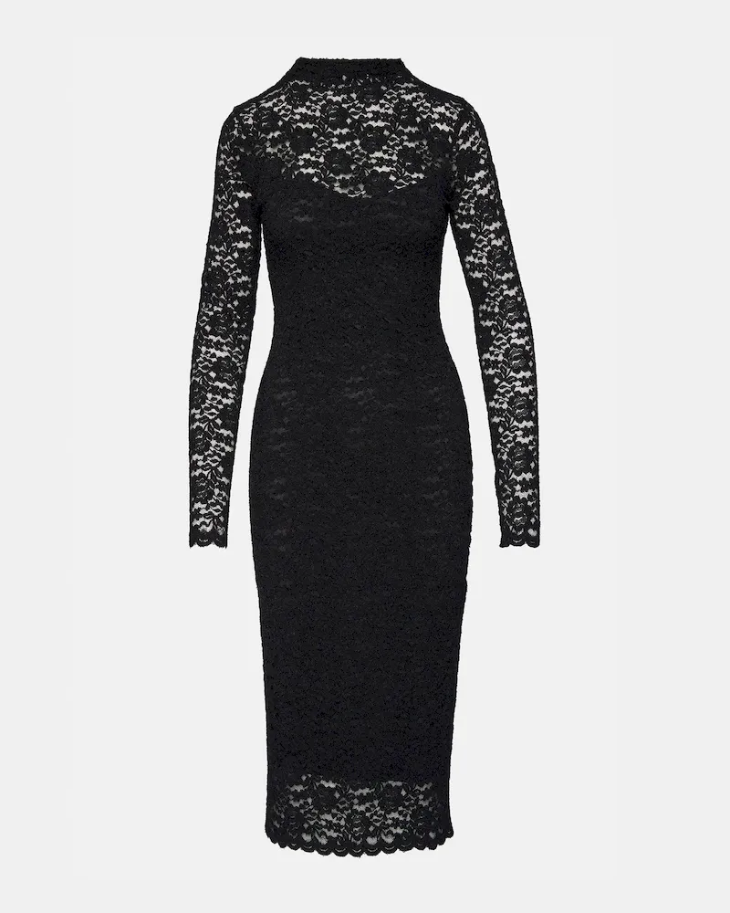 The VIVIENNE dress features a lined midi length sheer mesh outer layer finished with a mock neck and thumbhole sleeves.