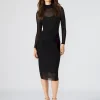 The VIVIENNE dress features a lined midi length sheer mesh outer layer finished with a mock neck and thumbhole sleeves.
