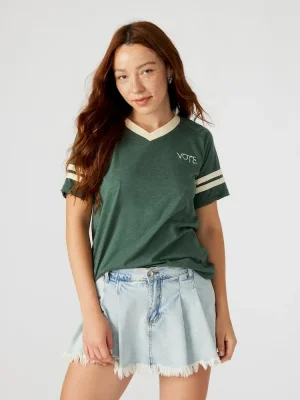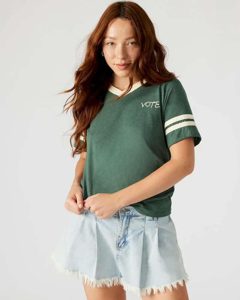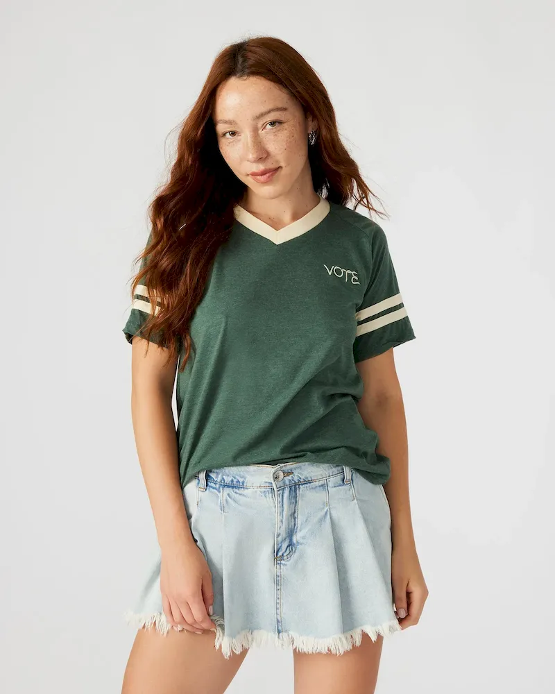 Enhance your wardrobe with our VOTE t-shirt. With a comfortable short-sleeved v-neck design and contrast color neckband and sleeve bands, you’ll make a stylish statement while promoting democracy. The added locker loop at the back neck allows for easy hanging, making it a versatile and convenient addition to your collection.