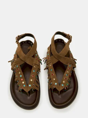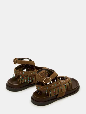 The WENDELL sandal features a comfortable footbed paired with an elegant strappy design. Adorned with sparkling rhinestones and delicate bead embellishments, it adds a refined touch to any outfit. The unique fringe detail enhances its stylish appeal, making it a sophisticated choice for both casual and dressy occasions. Crafted for both comfort and standout style, this sandal is a versatile addition to your footwear collection.