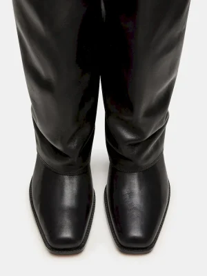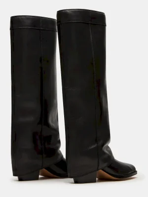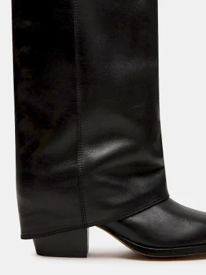 Elevate your footwear collection with the WINNICK BLACK LEATHER boot, featuring a sophisticated cuffed fold-over design that reaches the knee for a statement look. Crafted with a modern square-toe and supported by a sturdy block heel, this boot combines style with stability, making it ideal for all-day wear. The construction offers durability and a sleek finish, perfect for pairing with both casual and tailored outfits.