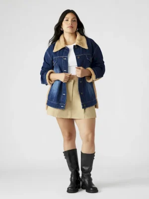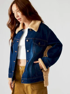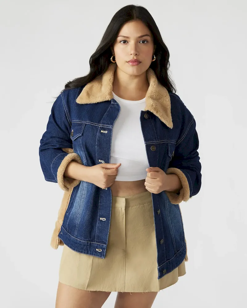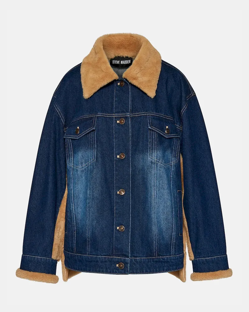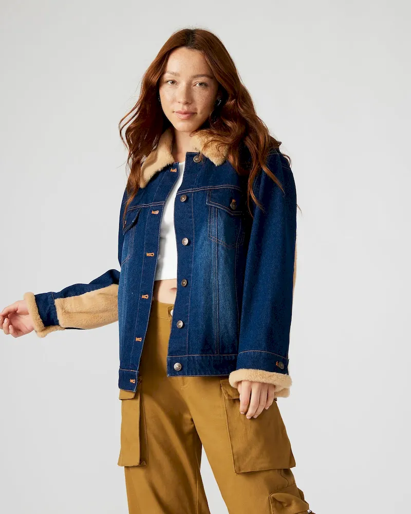 Expertly crafted with a trendy denim style, the WINONA denim jacket is a must-have for any fashion-forward individual. With its unique combination of fur detailing at the collar, back, and undersleeves, this trucker jacket adds a touch of sophistication to your wardrobe. Stay warm and stylish with functional chest and lower pockets, and an oversized fit that is perfect for any occasion.