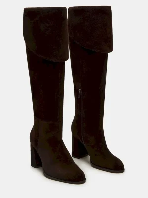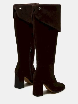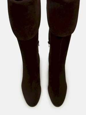 The WINSLET BROWN SUEDE boot features a knee-high silhouette with a sturdy block heel, offering both style and stability. Its rounded toe design ensures comfort for extended wear, making it a versatile choice for elevating your wardrobe with a refined, expert touch. This boot combines timeless elegance with practical functionality.