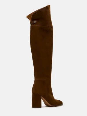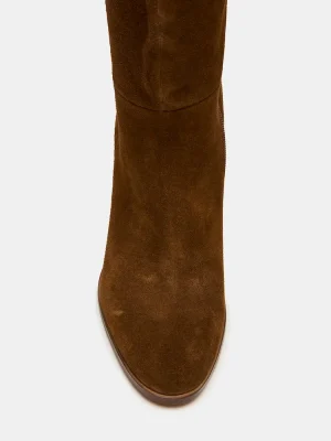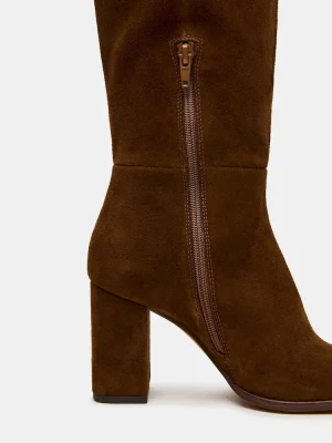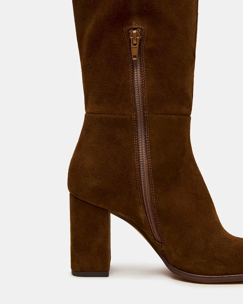 The WINSLET CHESTNUT SUEDE boot features a knee-high silhouette with a sturdy block heel, offering both style and stability. Its rounded toe design ensures comfort for extended wear, making it a versatile choice for elevating your wardrobe with a refined, expert touch. This boot combines timeless elegance with practical functionality.